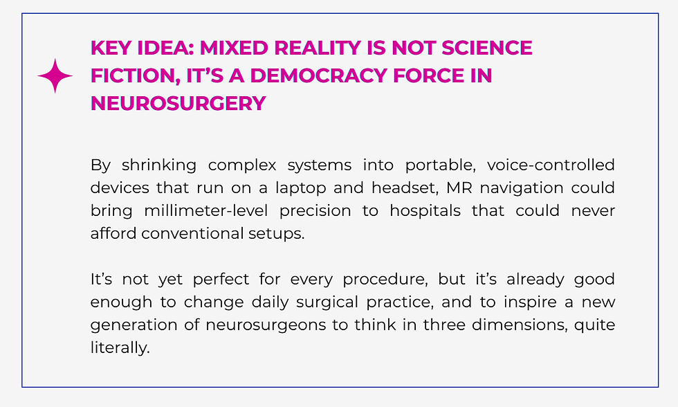 To overcome these limits, researchers are now experimenting with mixed reality (MR), a technology that blends virtual and physical space through head-mounted displays such as Microsoft’s HoloLens 2. Imagine wearing a visor that lets you see both the patient and a holographic model of their brain, aligned perfectly in 3D.